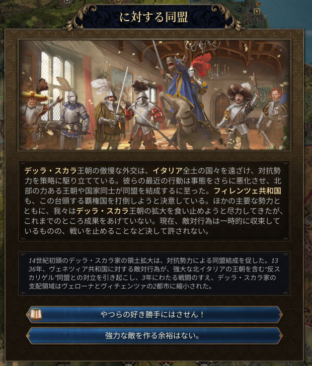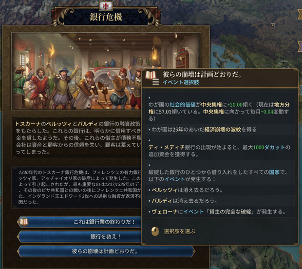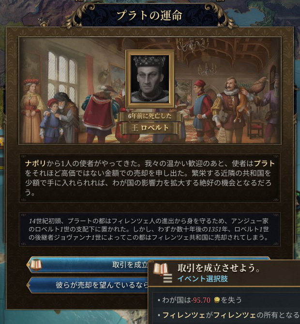 ちなみに史実では、百年戦争をビッグビジネスと捉えたようで、特にイングランドに戦争資金を貸し付けますがなかなかの暴利だったらしく、結果的にはローンの支払いを拒否されてどちらとも破産します。フィレンツェに半沢直樹はいなかったようです。