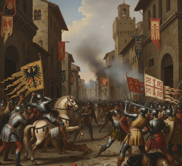 これが教皇派(ゲルフ)と皇帝派(ギベリン)というイタリア分裂に繋がるのです。